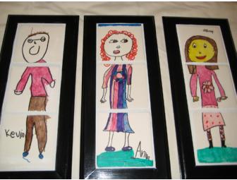 Each child drew a caricature of him/herself, over the length of 3 tiles. The tiles have been framed and are ready to be hung. This is an incredible keepsake!