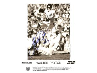 This photo was acquired in person at an autograph signing in 1997 for an NFL Films Video Release. The actual photo image are is 6"x 8" - and below picture is the Walter Payton Name and the NFL Films and Polygram Video logos and copyright notice. Back of photo has NFL Photos Copyright info. The photo is B&W. Signature is in BLUE marker, signed boldly "Walter Payton 34." This is NOT a machine printed signature; it is authentic and in excellent condition with minimal signs of handling