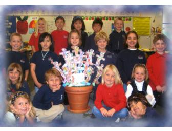 Each child colored a cross with flowers on it as well as decorated a Bible cover with silver and gold crosses. They did not stop there! They also included a new NIV Bible and two of their favorite classroom books. The Books are: "Does God Know How to Tie Shoes?" and "Who Made God?" And to tie it all together the Bible Verse 2 Peter 3:18 was written on the outside of the pot. "Grow in the Grace and Knowledge of our Lord and Savior Jesus Christ."