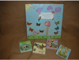 The class made five sets of four coasters and five 12x12 outdoor tiles hand painted and decoupaged by the children. Each set contains four coasters and one 12x12 tile. This unique project is sure to bring joy to the winning bidder for years to come!