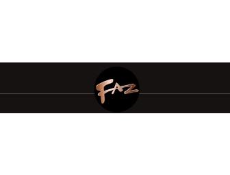 Think of all the delicious meals you'll enjoy, free from cooking, with $100.00 in FAZ Restaurant Gift Certificates. If you haven't been to Faz, it's Mediterranean-style cuisine is delicious. The restaurant has wood burning ovens, a smoker and a rotisserie creating a warm environment and an extensive menu with something for everyone. If you're hungry for roasted chicken, kabobs or brick oven pizza, Faz is the place for you.